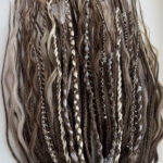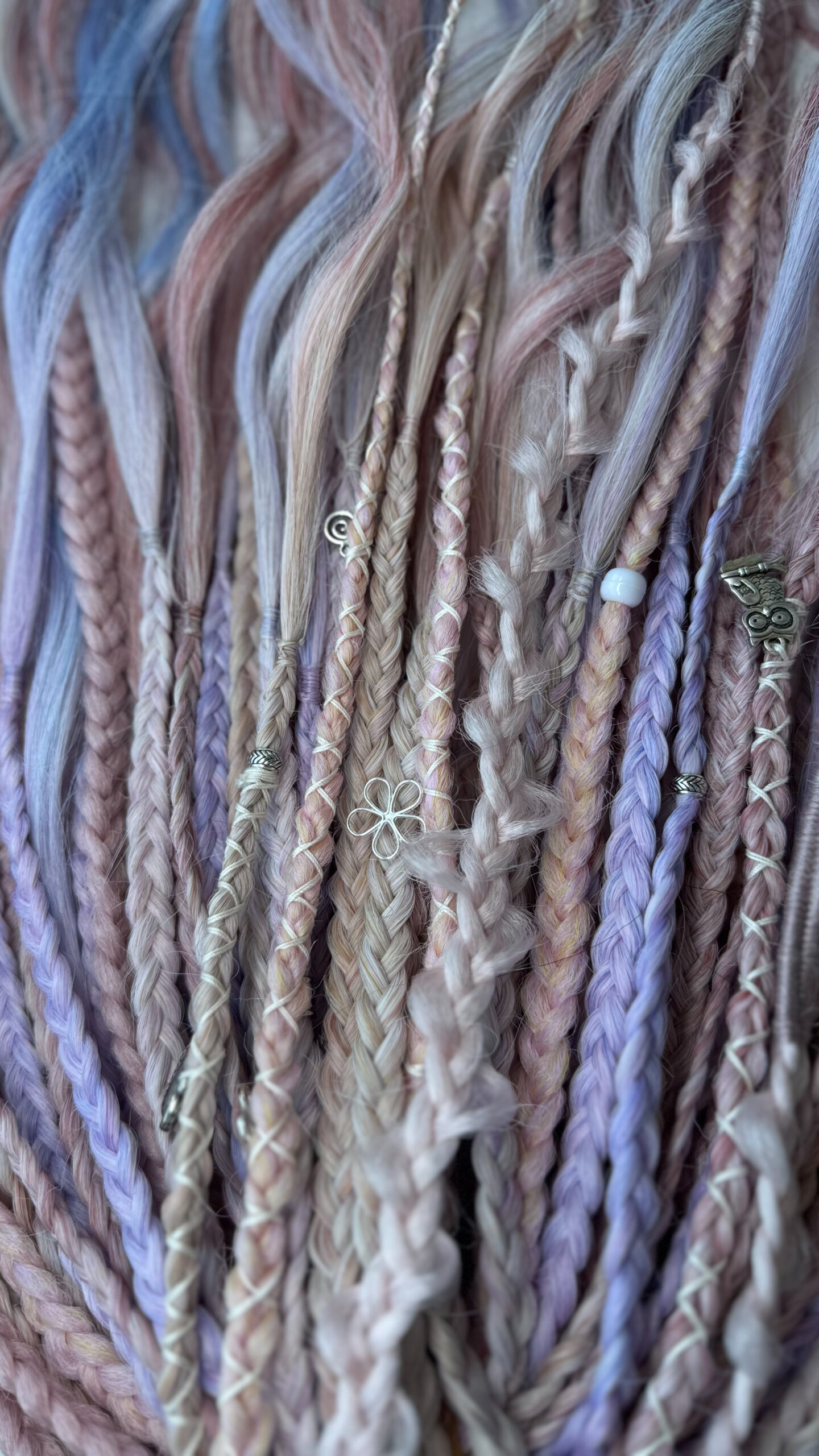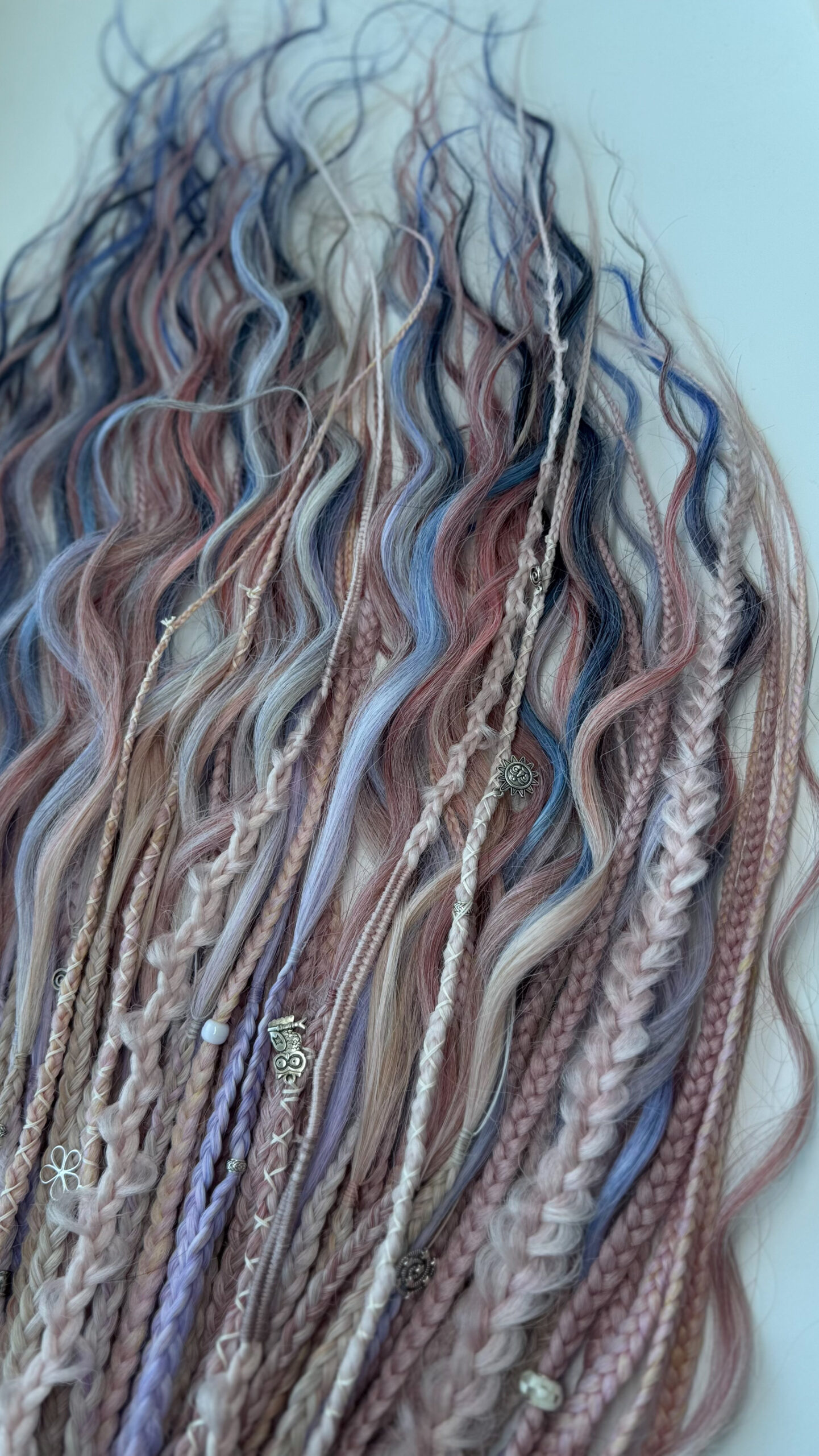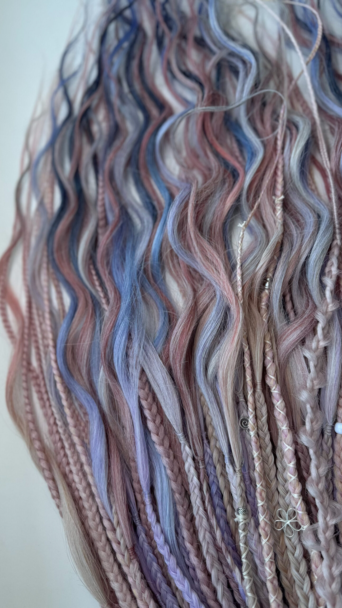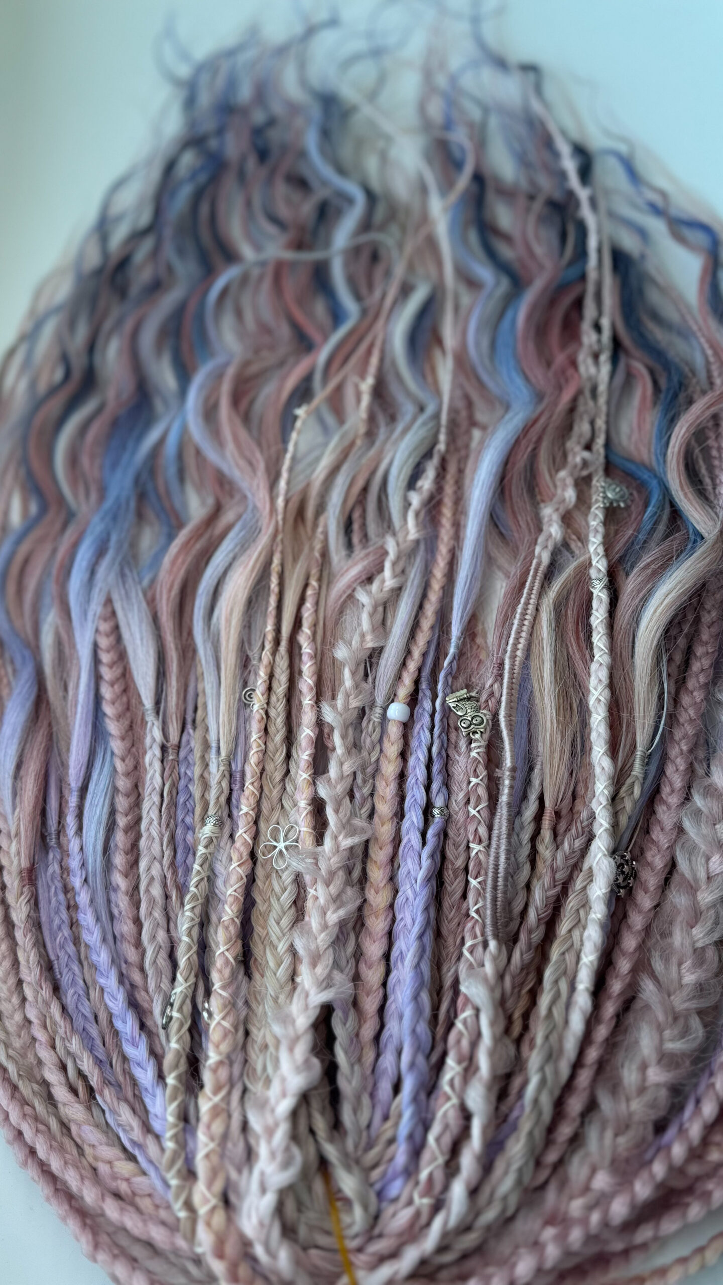 Zestaw zawiera warkoczyki z luźnymi końcami oraz dodatkowe cienkie warkoczyki dekoracyjne, ozdobione akcesoriami do włosów (koraliki, elementy metalowe), które nadają fryzurze unikalny charakter.